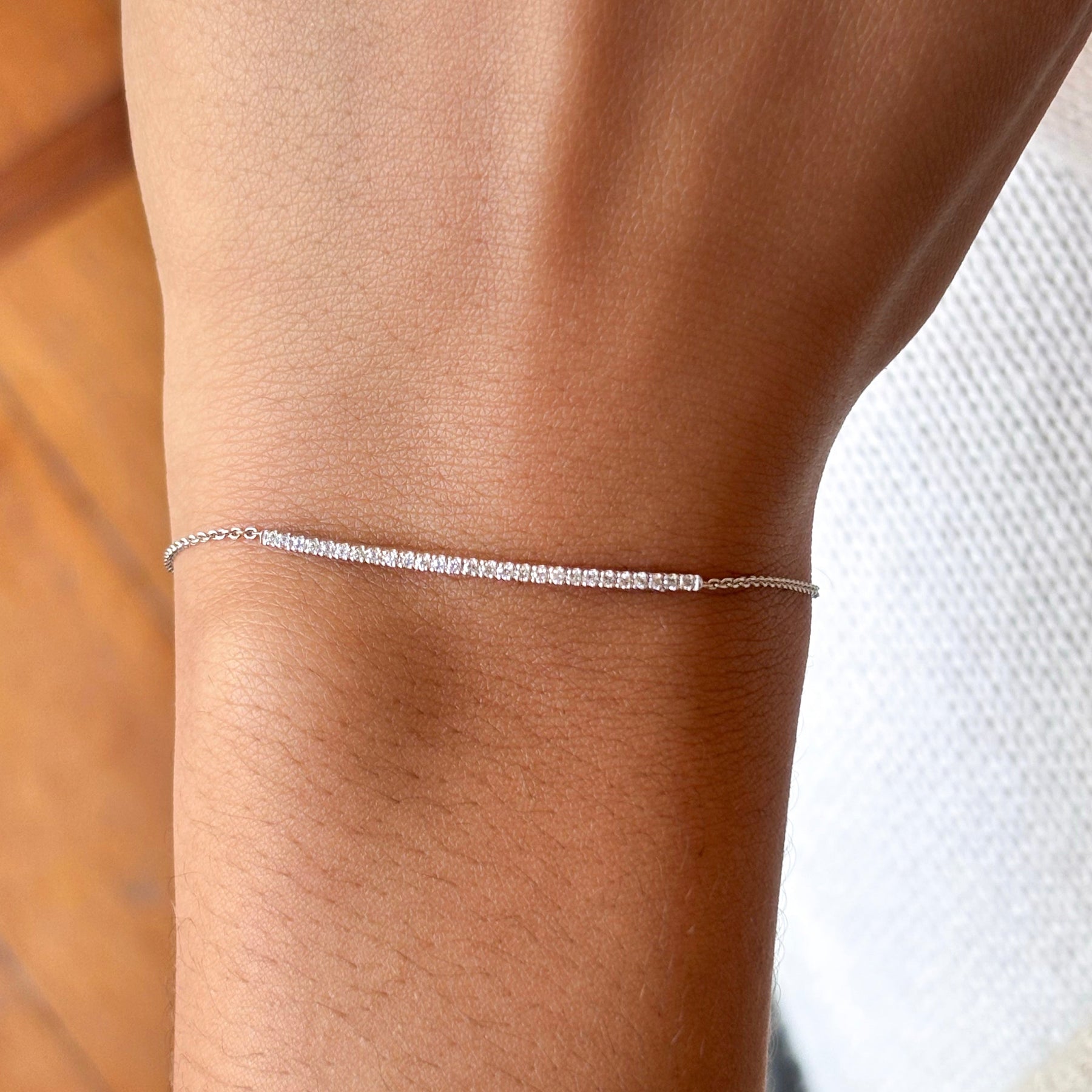 This minimalist bar bracelet features exquisite round lab grown diamonds, adding a touch of elegance to any outfit. Crafted with precision, it offers a timeless design that is both stylish and ethical.