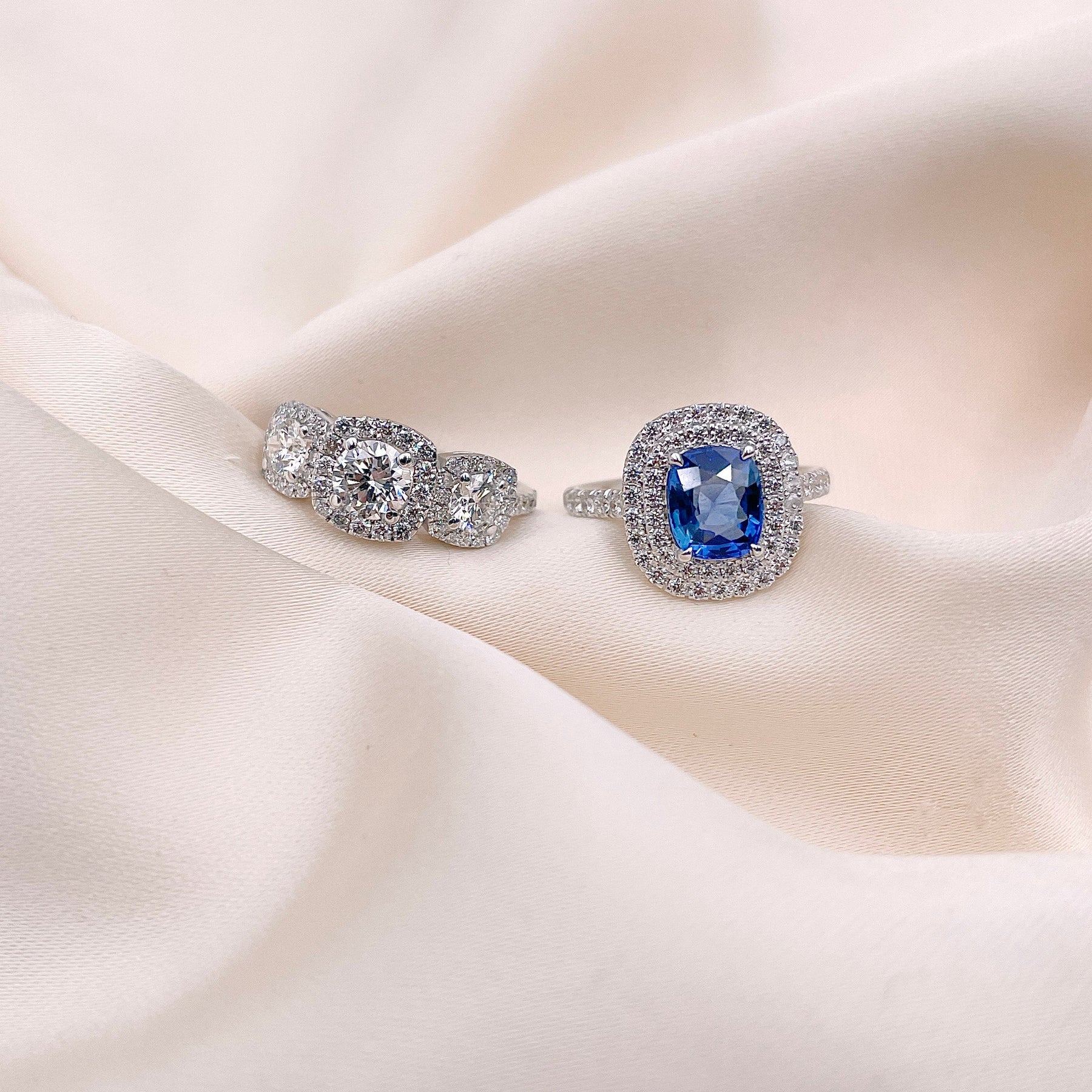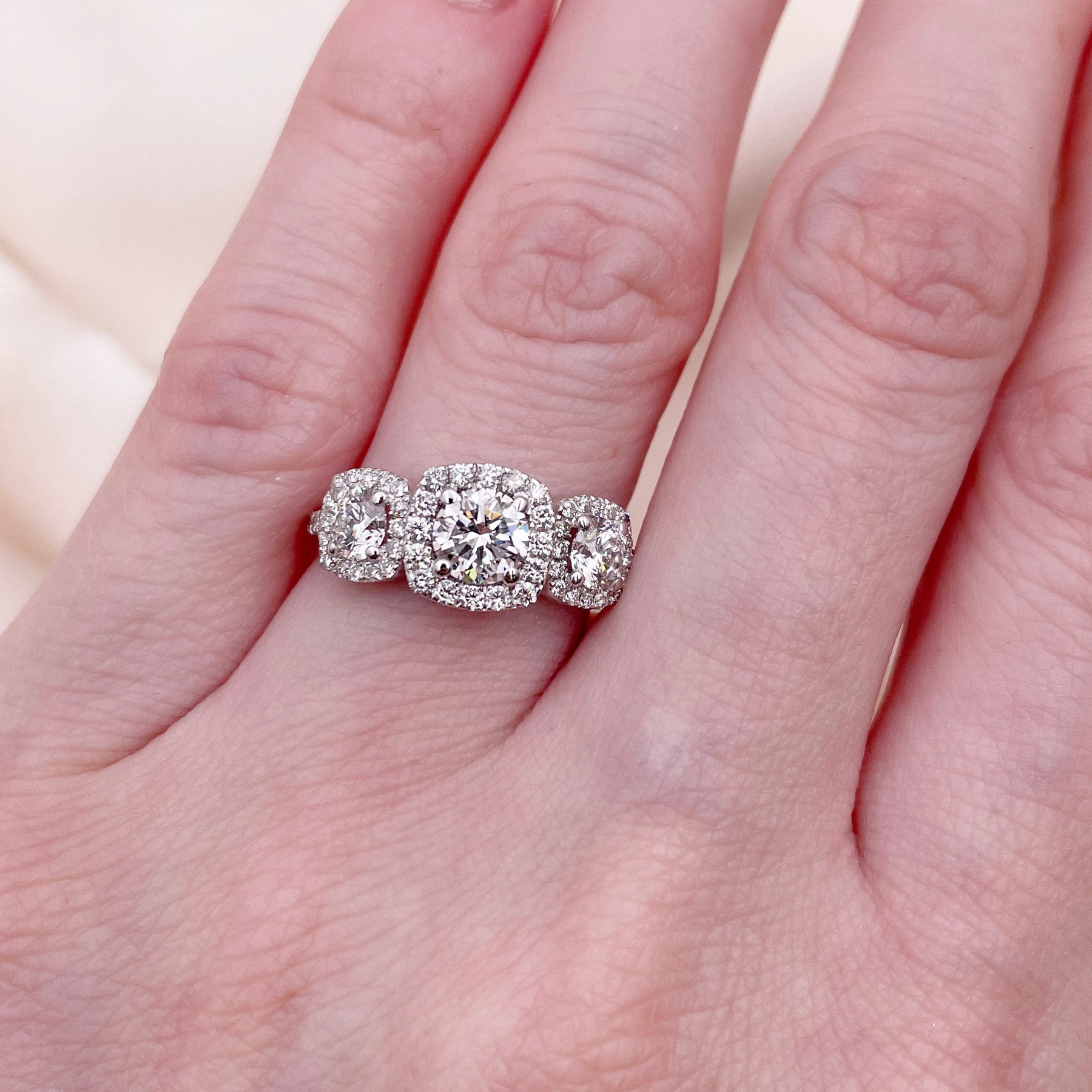 Cleo is a stunning trilogy ring featuring round diamonds and a cushion halo. This captivating design highlights the beauty of each individual diamond, creating a timeless piece of jewelry perfect for any occasion.