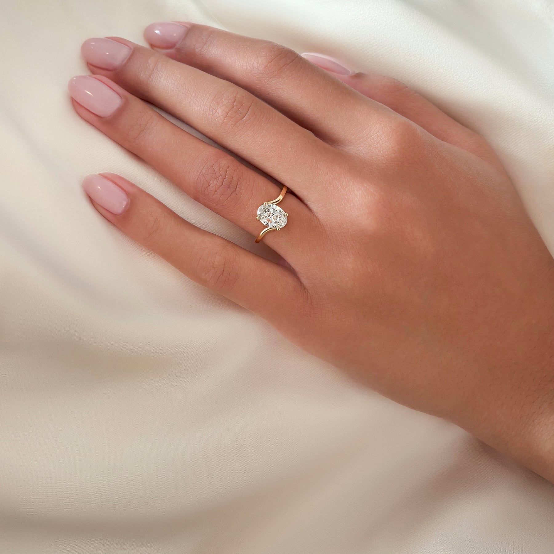 The Jade solitaire ring showcases a brilliant oval cut lab-grown diamond set on an elegantly twisted band. This expertly crafted design highlights the diamond’s radiance while adding a subtle, sophisticated curve to the band, creating a refined blend of classic and contemporary styles. Perfect for those who appreciate timeless elegance with a distinctive flair.
