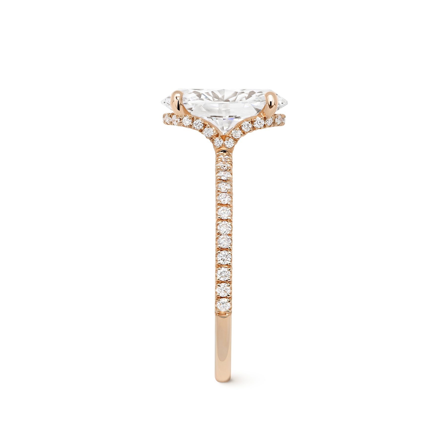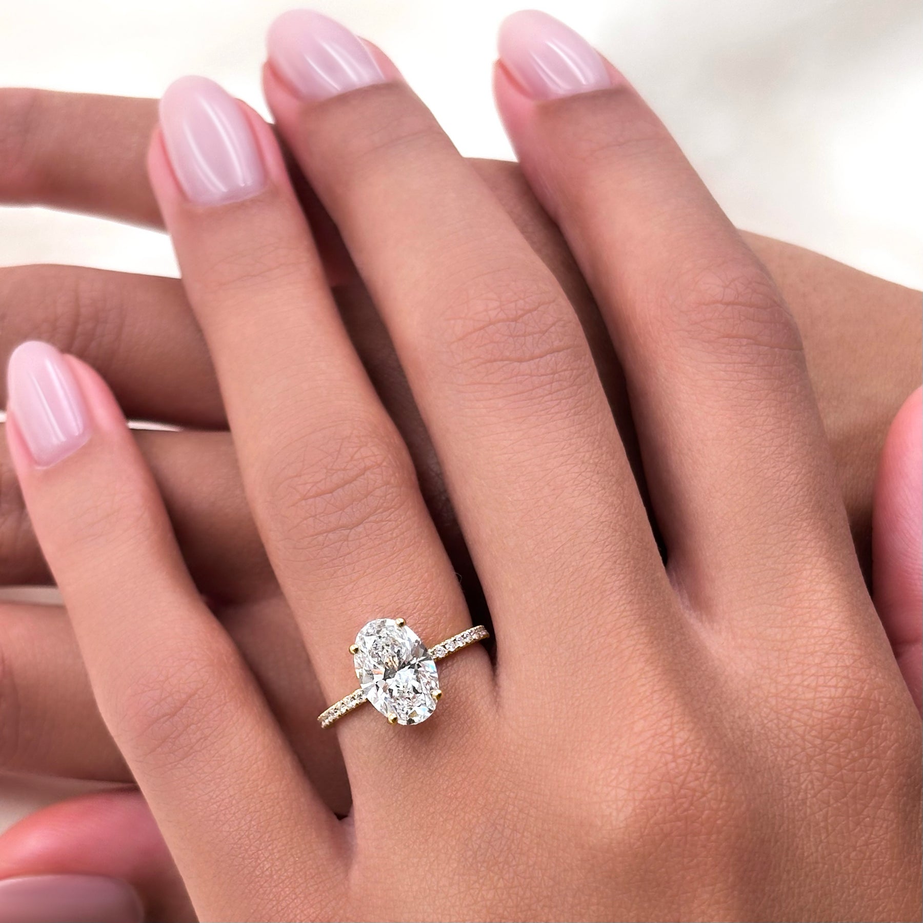 Oval cut diamond engagement ring with hidden halo and pavé band