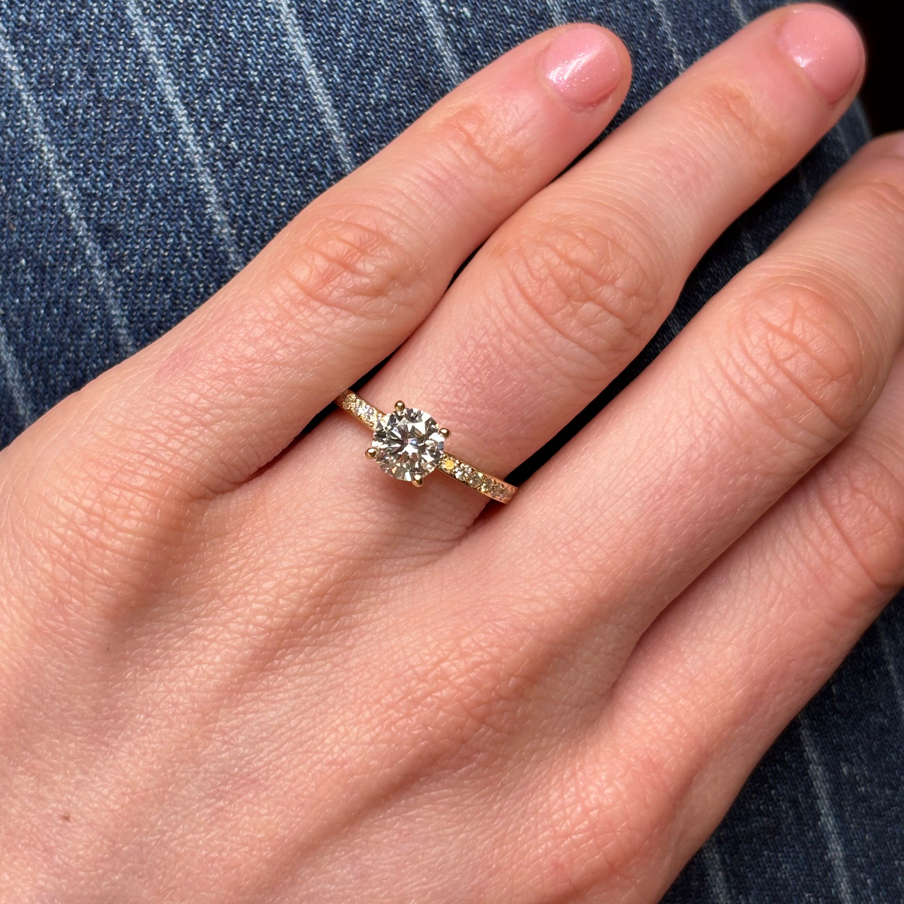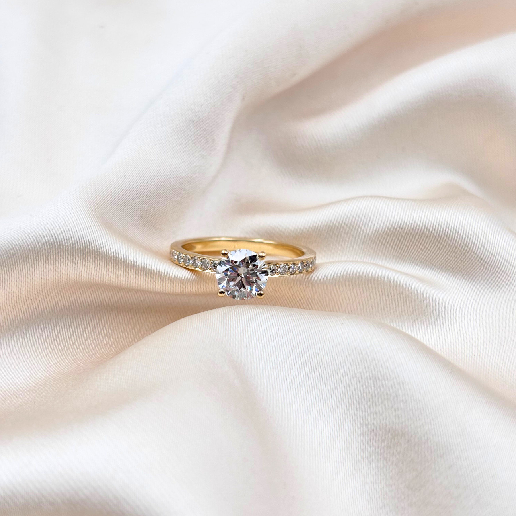The Lucia is a diamond engagement ring that is sure to captivate. Its round diamond center stone is held securely in a four-pronged setting, while the tapering band is adorned with round diamond accents, each securely set with a bead setting. This ring is perfect for stacking with a wedding band.