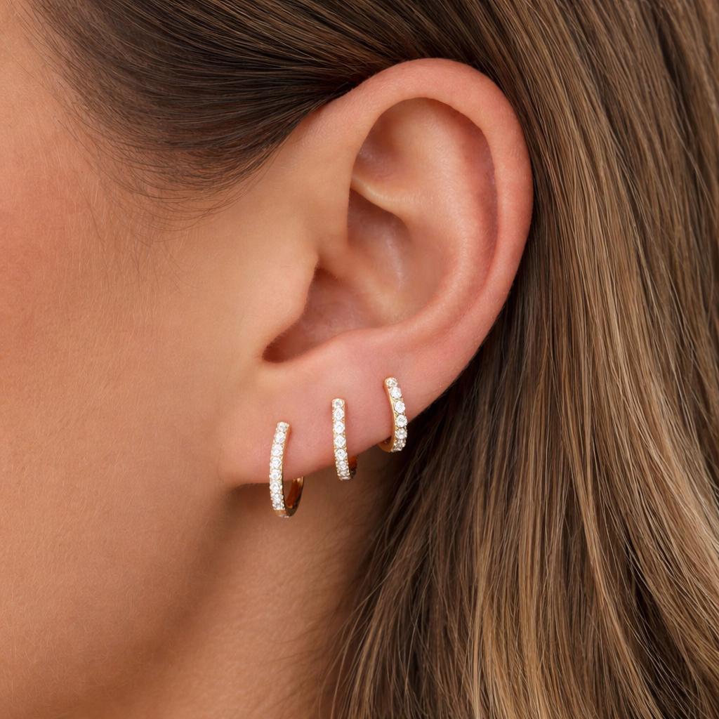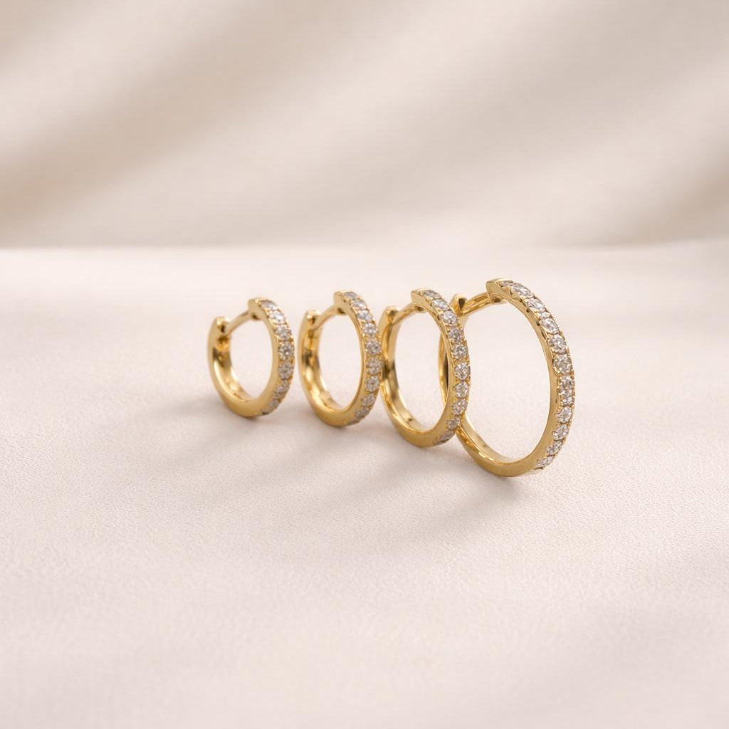 Ontdek onze veelzijdige gouden oorringen gezet met lab grown diamanten, verkrijgbaar in verschillende maten die passen bij jouw persoonlijke stijl en voorkeur. Of je nu de voorkeur geeft aan subtiele, ingetogen elegantie of aan opvallende, statement-makende juwelen, deze oorringen bieden een schitterende glans met de zekerheid van ethisch verkregen diamanten. Elke maatoptie behoudt dezelfde superieure afwerking en helderheid, zodat jij de perfecte verhouding kan kiezen die past bij jouw gezichtsvorm en esthetische voorkeuren.