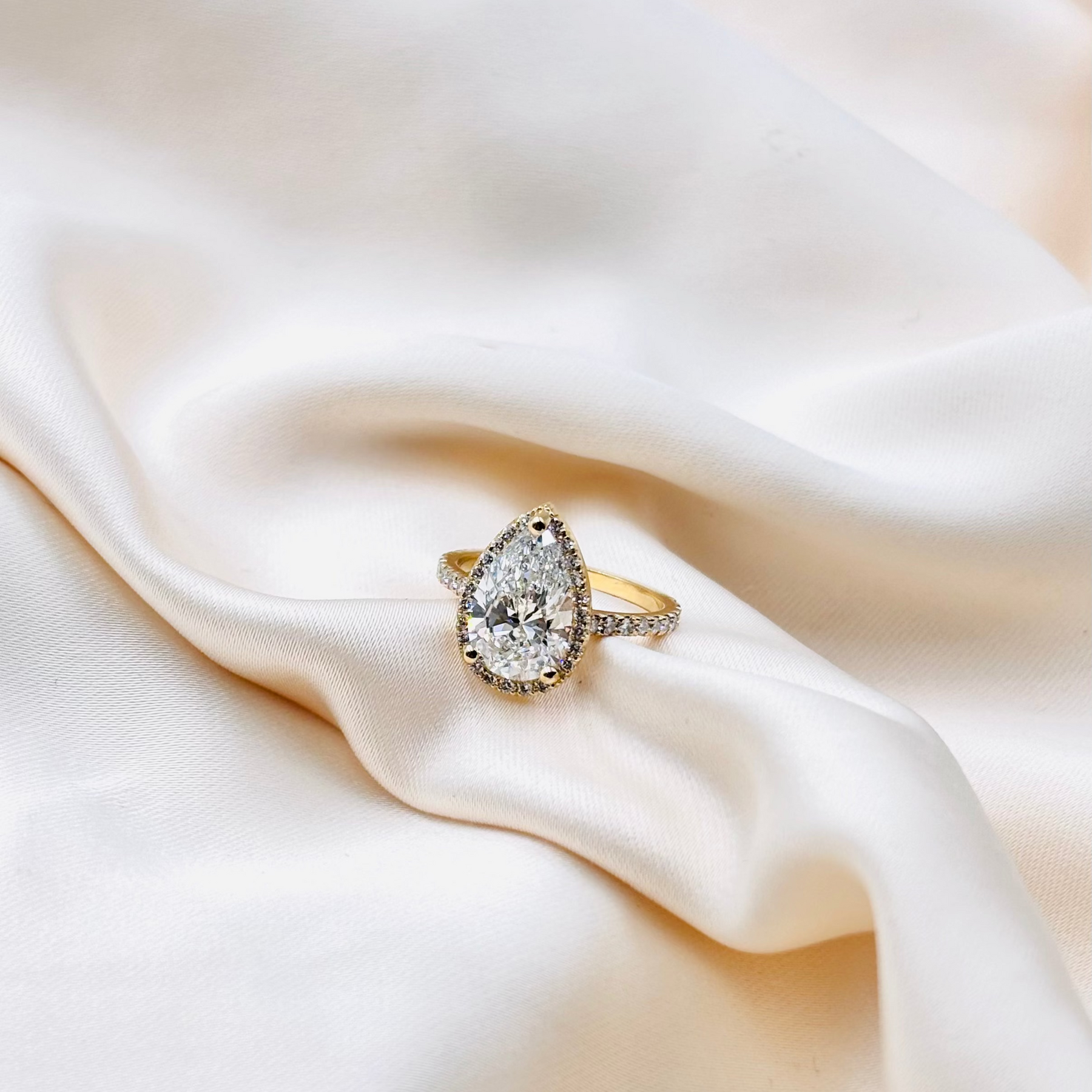 Een peervormige diamant in een halo cluster is het adembenemende middelpunt van deze verlovingsring met glinsterende accenten.