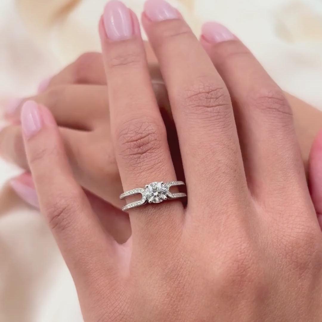 Deze gedurfde en verfijnde verlovingsring is een echt kunstwerk en een eerbetoon aan innovatief ontwerp. Deze verlovingsring heeft een open dubbele U-vormige band bezet met ronde briljanten die de fonkeling van de ring versterken. De centrale ronde briljant-geslepen diamant is met griffen gezet, waardoor de ring een elegante stijl bekomt en sierlijk op de vinger zit. Deze verlovingsring, de perfecte combinatie tussen elegantie en verfijning, is een echte aandachtstrekker.