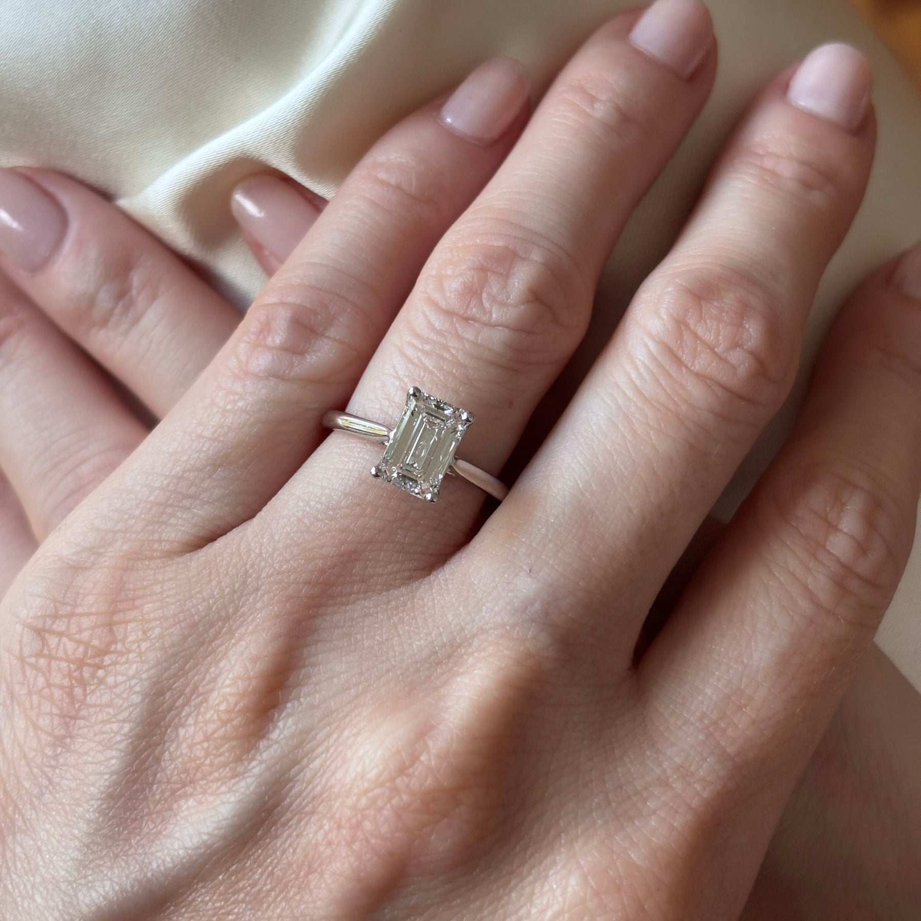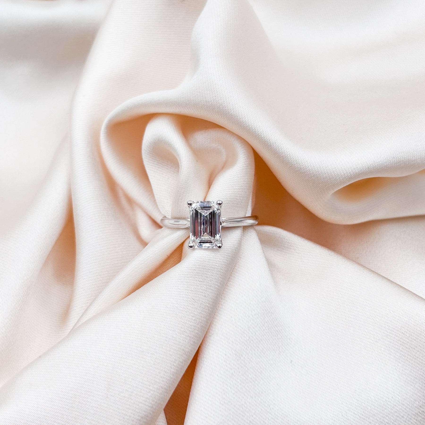 Deze opvallende ring bevat een prachtige centrale smaragd-geslepen diamant in een klassieke solitaire zetting met vier griffen. De fijne band laat de middensteen tot zijn recht komen en zorgt toch voor een subtiele elegantie.